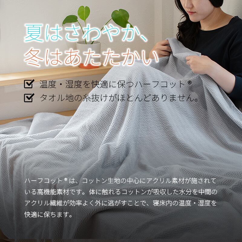 タオル地の欠点である、パイル抜けもほとんど起こしません。寝室に、リビングに、レジャーに一年中お使いいただけます。